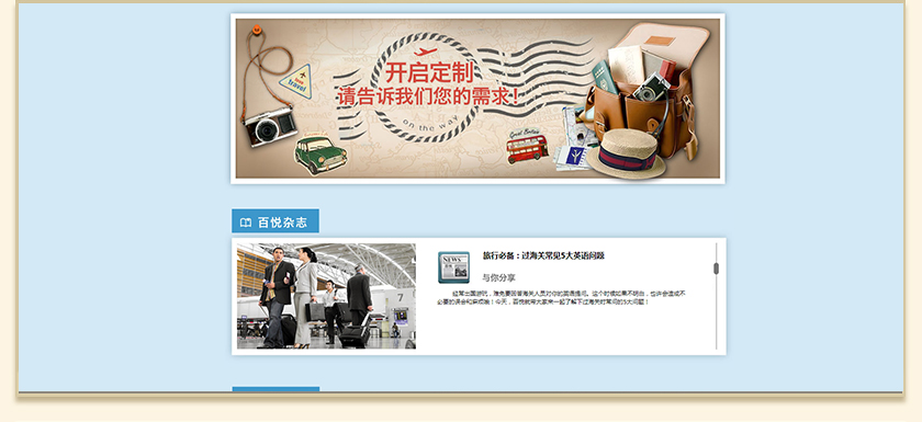 Project Description 百悦逸游于2012年初由二位资深的旅行家创办,是成都传媒集团旗下成都新闻国际旅行社有限公司的高端旅游品牌,总部位于成都高新区天府大道中段美年广场。在百悦逸游成立之前,创始团队亲自到全球三十多个国家实地考察,带着第一手的资讯和执着的信念创立了中国西部第一家真正意义上的私人定制旅行机构。百悦的旅行不是跟团挤大巴,不是十天去十个国家,更不是没完没了的... Official website address 克孜勒苏柯尔克孜http://www.100.travel I want to share